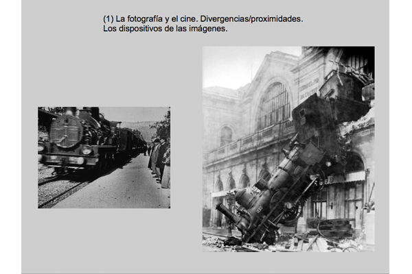 La imagen a la derecha es una fotografía de H. Roger Viollet documentando un accidente en la estación de Montparnasse, el día 22 de octubre de 1895. La segunda, a la izquierda, es la llegada del tren a la estación de París, una película de 45 segundos de los hermanos Auguste y Louis Lumière. La fotografía de Viollet nos hace pensar en una obra de René Magritte, pero también en alguna instalación de arte contemporáneo, por su desproporcionalidad y extrañeza. Otro dato interesante de la imagem: no está presente nadie en la foto, como sí el único espectador fuéramos nosotros. Existen otras imágenes, desde luego, desde otros ángulos y con personas que miran al desastre, pero ésta detiene su mirada hacia al elemento que se desencajó, que ha perdido su línea de orientación, su trayectoria, y se ha derrumbado sobre su propia origen.