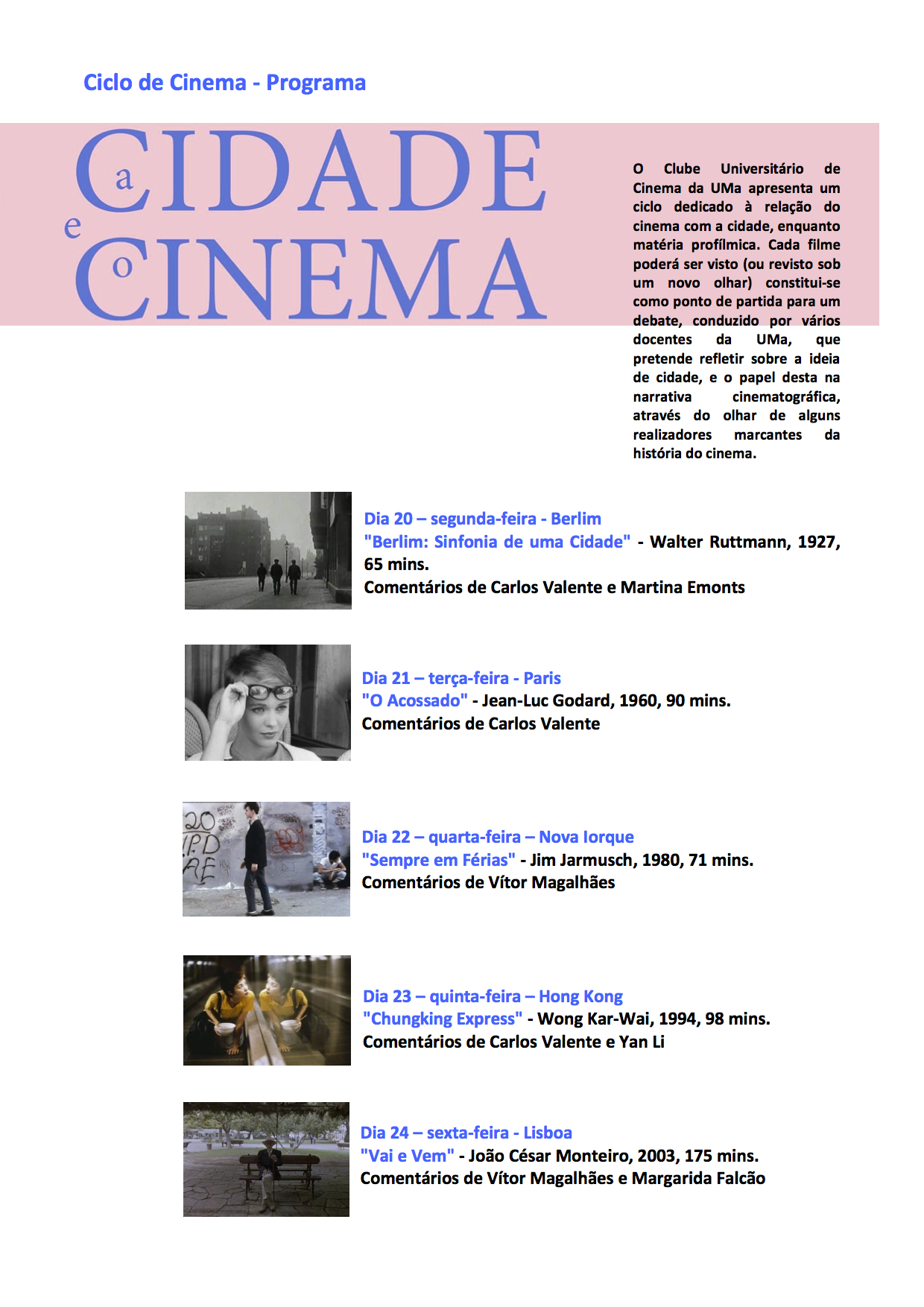 O Clube Universitário de Cinema da UMa apresenta um ciclo dedicado à relação do cinema com a cidade, enquanto matéria profílmica. Cada filme poderá ser visto (ou revisto sob um novo olhar) constitui-se como ponto de partida para um debate, conduzido por vários docentes da UMa, que pretende refletir sobre a ideia de cidade, e o papel desta na narrativa cinematográfica, através do olhar de alguns realizadores marcantes da história do cinema.
