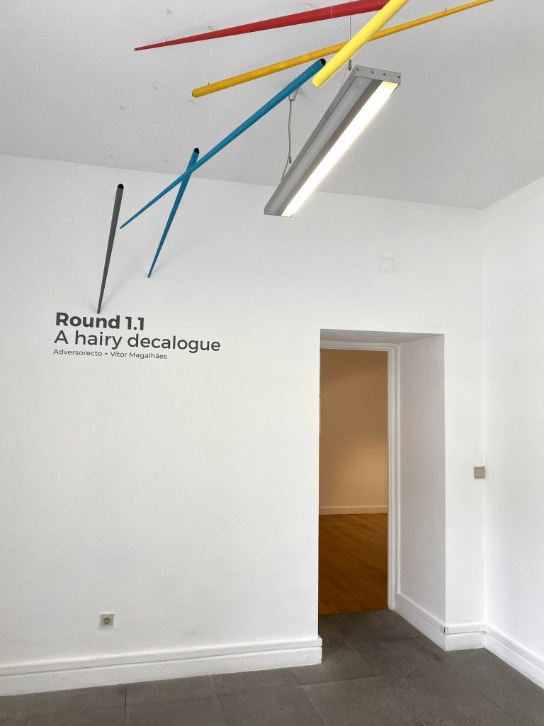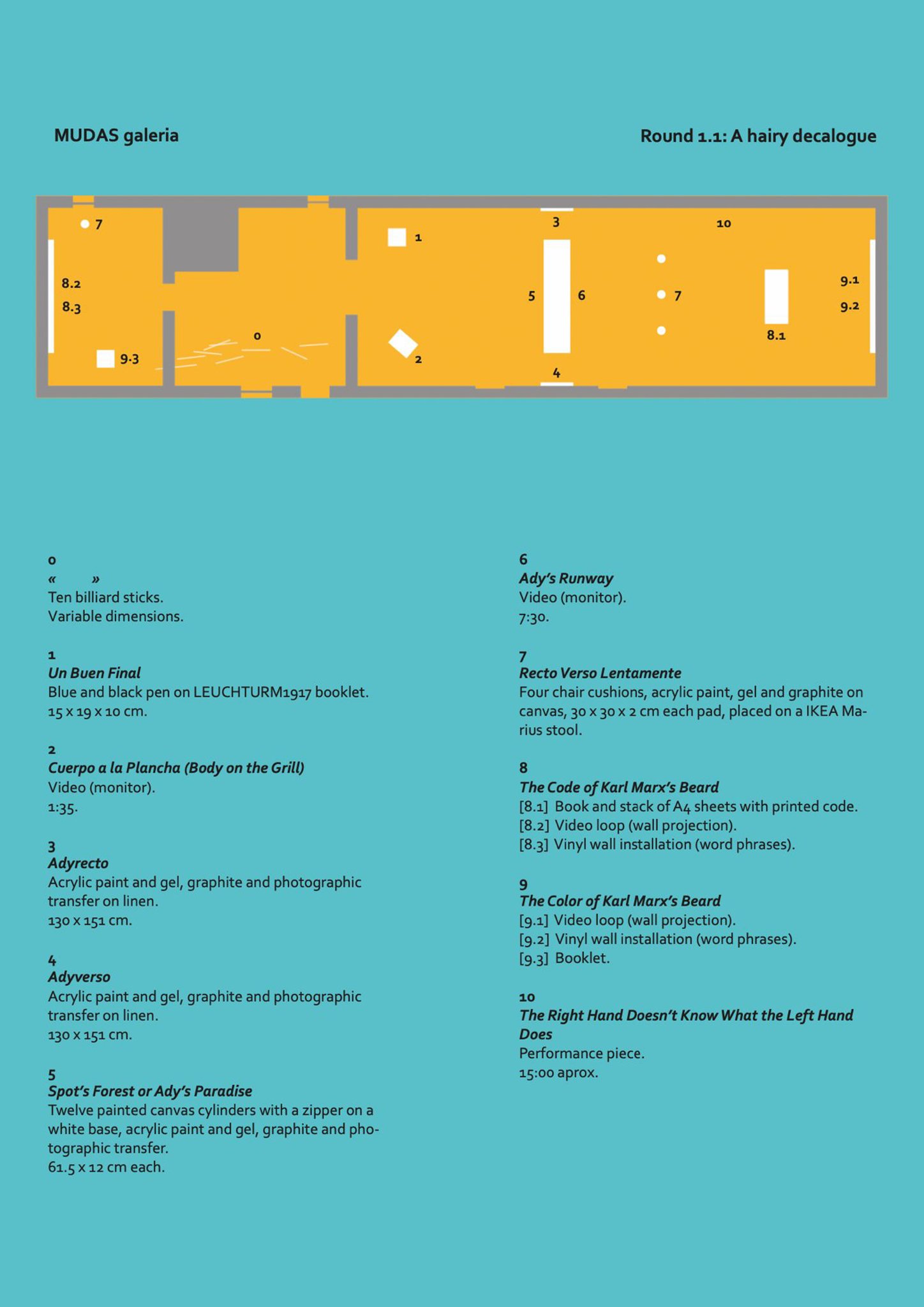 Exposição. Não será por acaso que as três palavras - proibição, inibição e exposição - têm histórias relacionadas. O curador convidado ex post facto terá lançado o conceito inesperado do decálogo sobre uma exposição previamente proposta, formada por dez peças, como uma espécie de rede de pesca náutica. A rede surpresa do curador terá, por sua vez, transformado a proibição na inspiração para fundir as peças individuais em novas obras. A proposta original de exposição apresentava uma “luta” entre Karl e Ady: Marx e o seu companheiro peludo. Uma barba e um cão. Um paraíso florestal. Um desfile de moda. Um pescoço e ombros que se contorcem por baixo de uma barba que não se vê. Na rede curatorial, o cão ter-se-á virado do avesso para reaparecer como uma barba feita de tacos de bilhar. As salas da galeria transformam-se numa mesa de jogo para uma partida, no preciso momento de contacto produzido pela tacada de abertura. Crac!