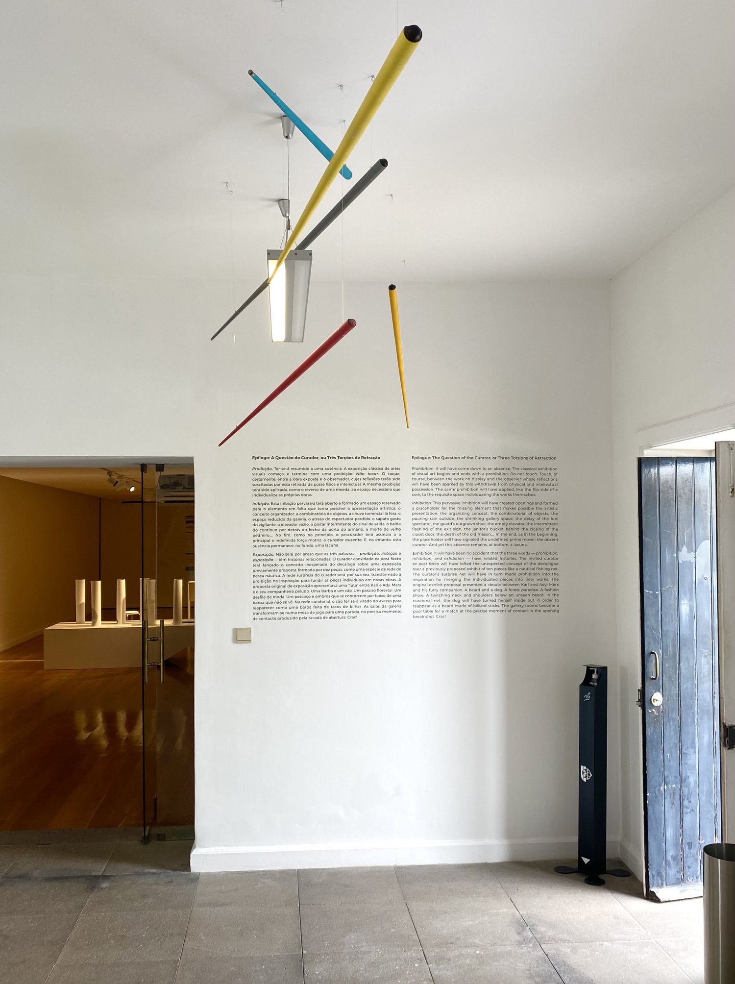 Inibição. Esta inibição pervasiva terá aberto e formado um espaço reservado para o elemento em falta que torna possível a apresentação artística: o conceito organizador, a combinatória de objectos, a chuva torrencial lá fora, o espaço reduzido da galeria, o atraso do espectador perdido, o sapato gasto do vigilante, o elevador vazio, o piscar intermitente do sinal de saída, o balde do contínuo por detrás do fecho da porta do armário, a morte do velho pedreiro…. No fim, como no princípio, o procurador terá assinalado a principal e indefinida força motriz: o curador ausente. E, no entanto, esta ausência permanece, no fundo, uma lacuna.